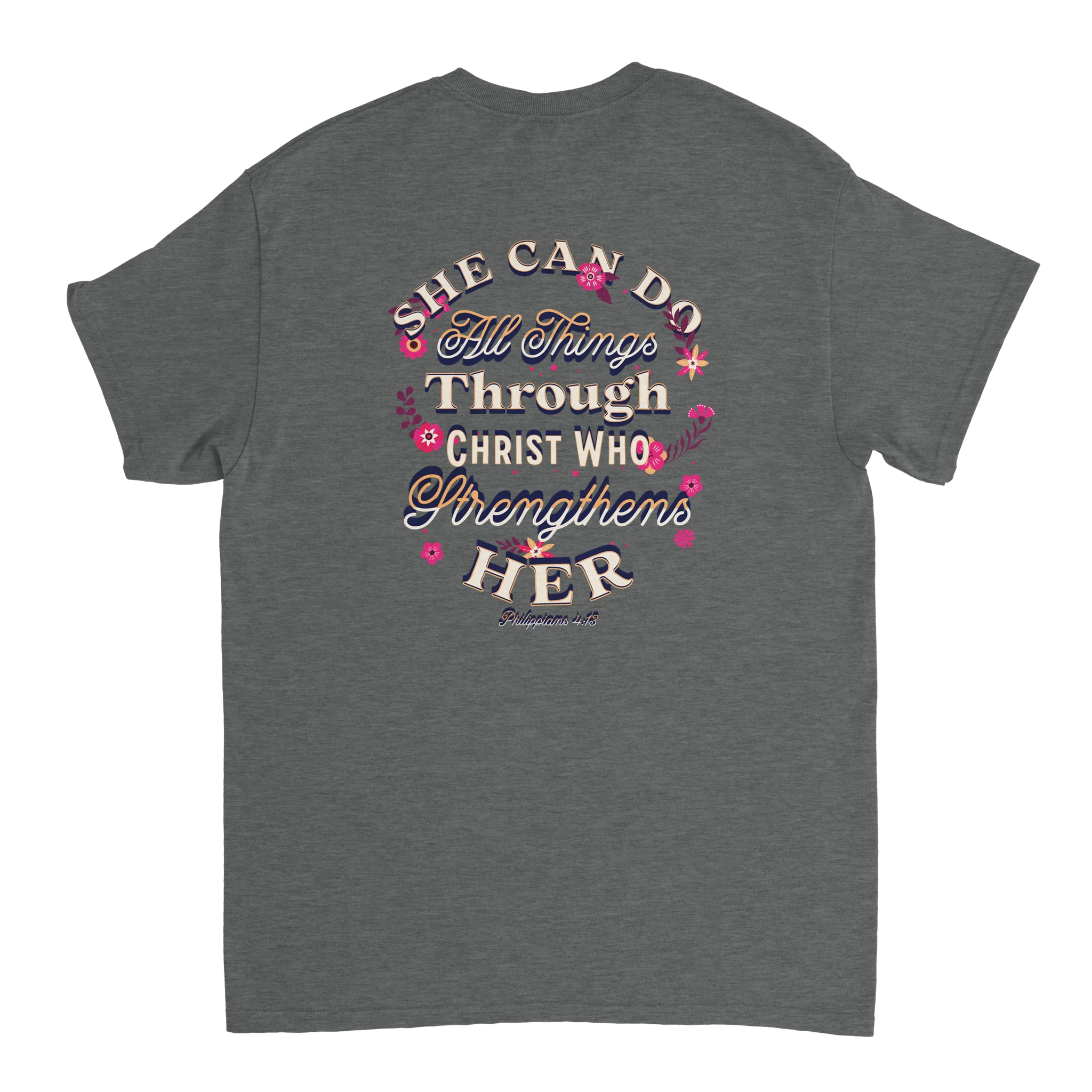 The She Can Do All Things t-shirt is more than apparel—it’s a declaration of strength and belief. Inspired by Philippians 4:13, this tee reminds every young woman that she is capable of achieving greatness through Christ who strengthens her. Perfect for everyday wear, youth programs, or community events, this shirt spreads a message of hope and confidence rooted in faith.